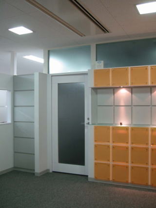 蛍光アクリル板を用いたプログラミング会社の内装